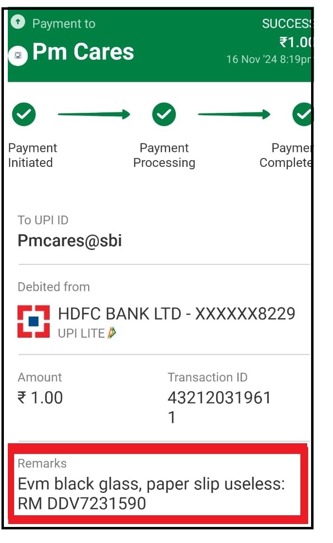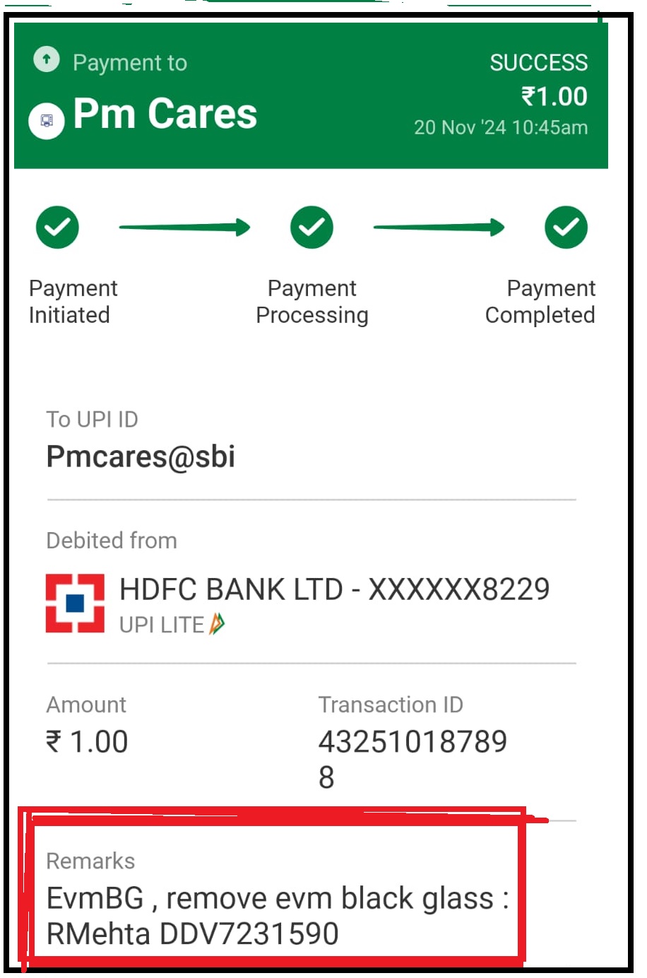 Now remark or message field in UPI has limit of 50 characters in many APPs like BHIM. So instead of name, you may write just initials. But pls do mention your voterid to PM as far as possible. Also, if you wish to be part of EvmHataoSena, then pls ensure that first words in message are EvmBlackGlass or 'Evm Black Glass' or EvmBG, on any evm related messages you send.